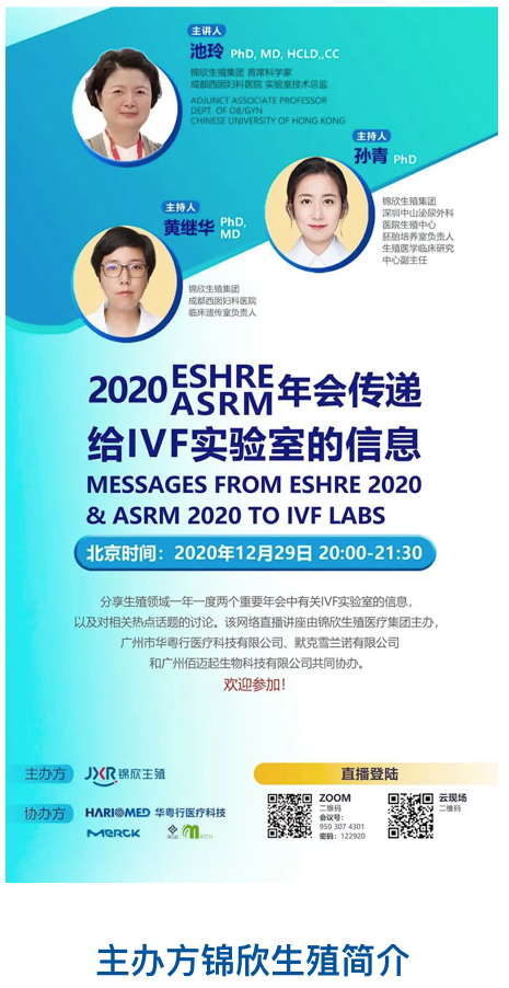 2020年12月29日,锦欣生殖代表科学家池玲教授,通过线上直播的形式,与大家分享生殖领域内两大年会——ESHER2020(欧洲人类生殖与胚胎学学会)和ASRM2020(美国生殖医学会)中有关IVF实验室的信息,以及对相关热点话题的讨论。